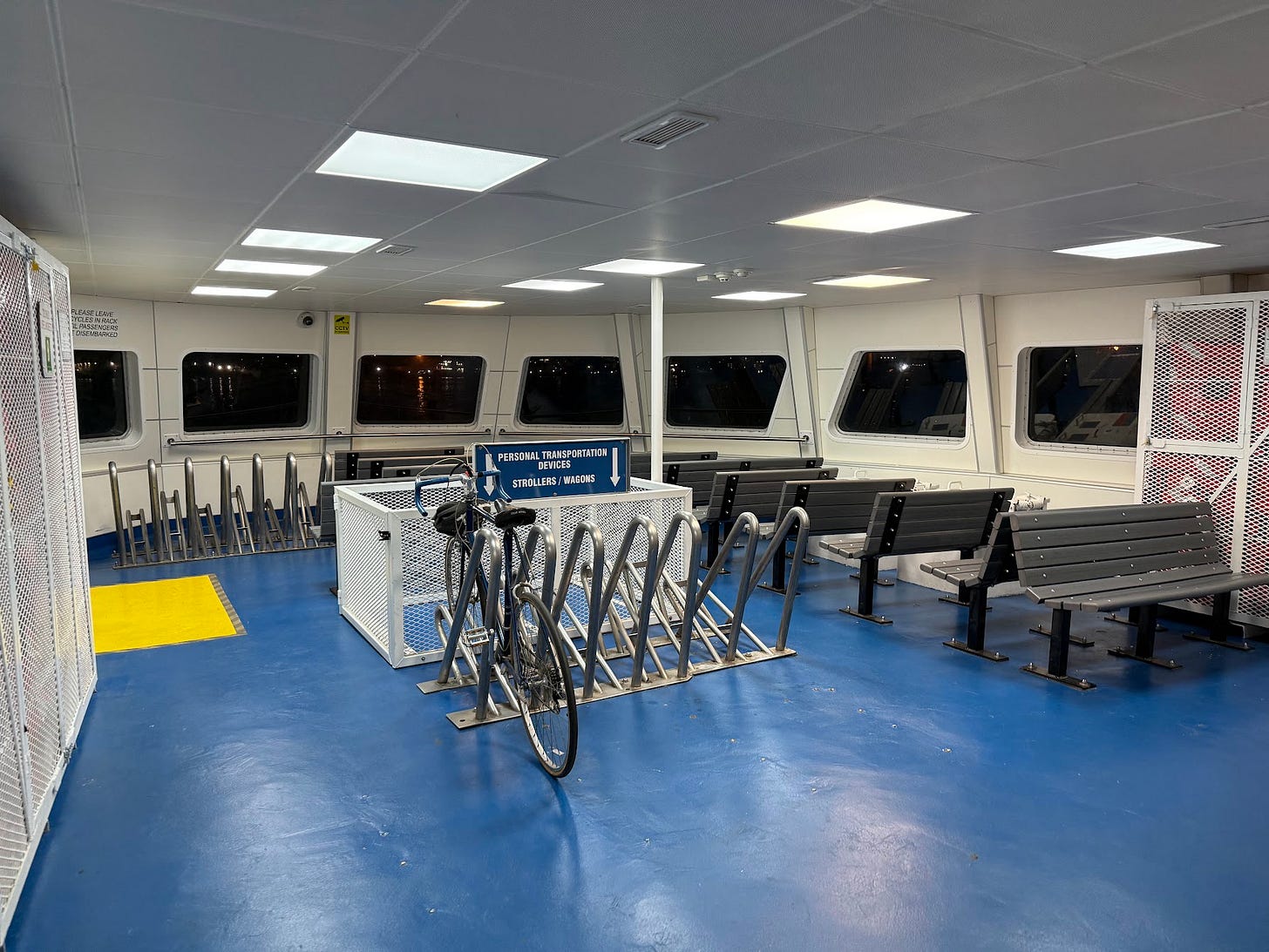 The interior of the ferry even featured numerous bike racks. Given that even at 10:30 p.m. someone parked their bike, it must be much busier at times.