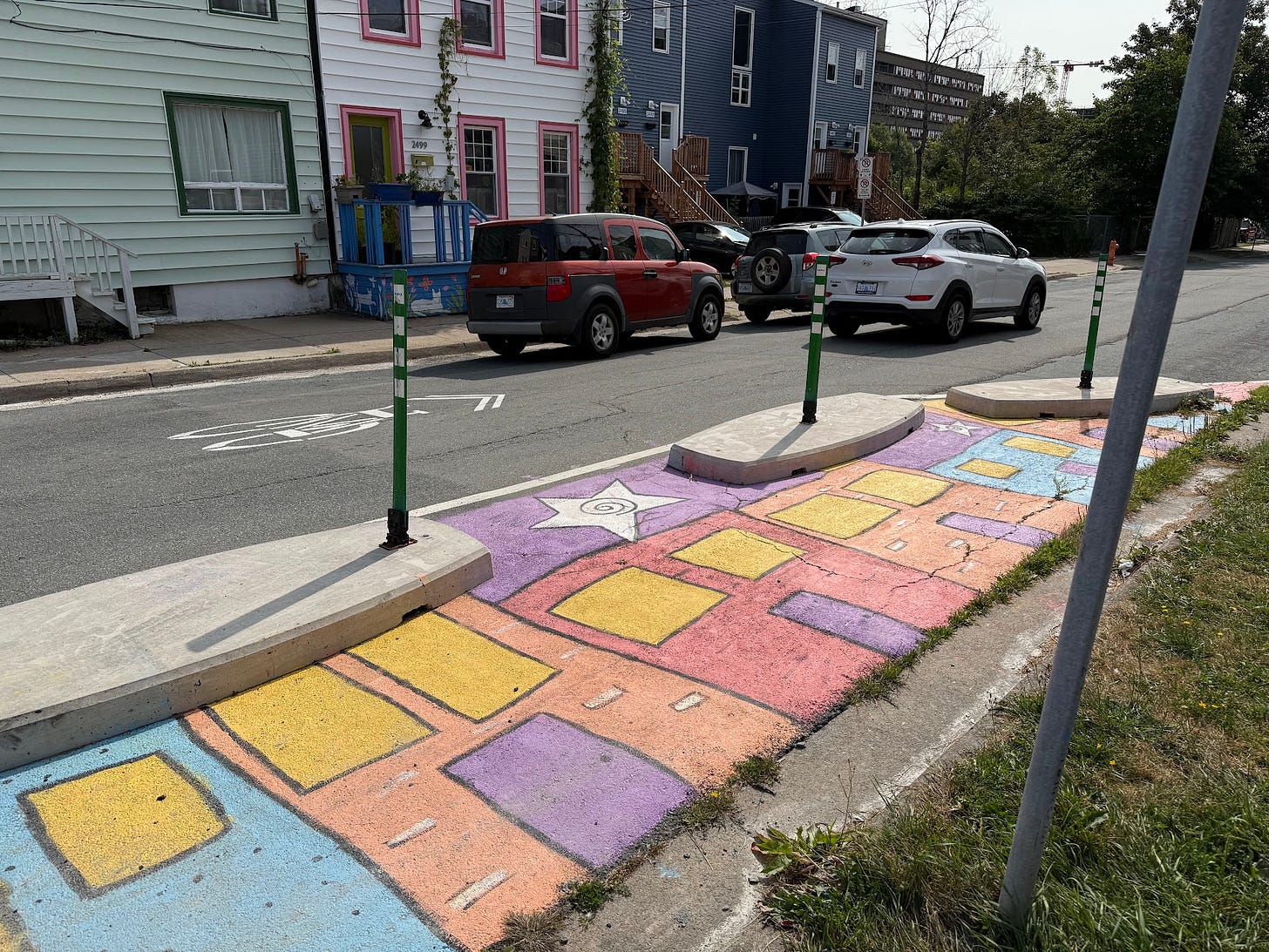 It was lovely to see this street art used in conjunction with concrete and flex posts to make this intersection safer by reducing crossing distance and narrowing the street, at little cost to the city.