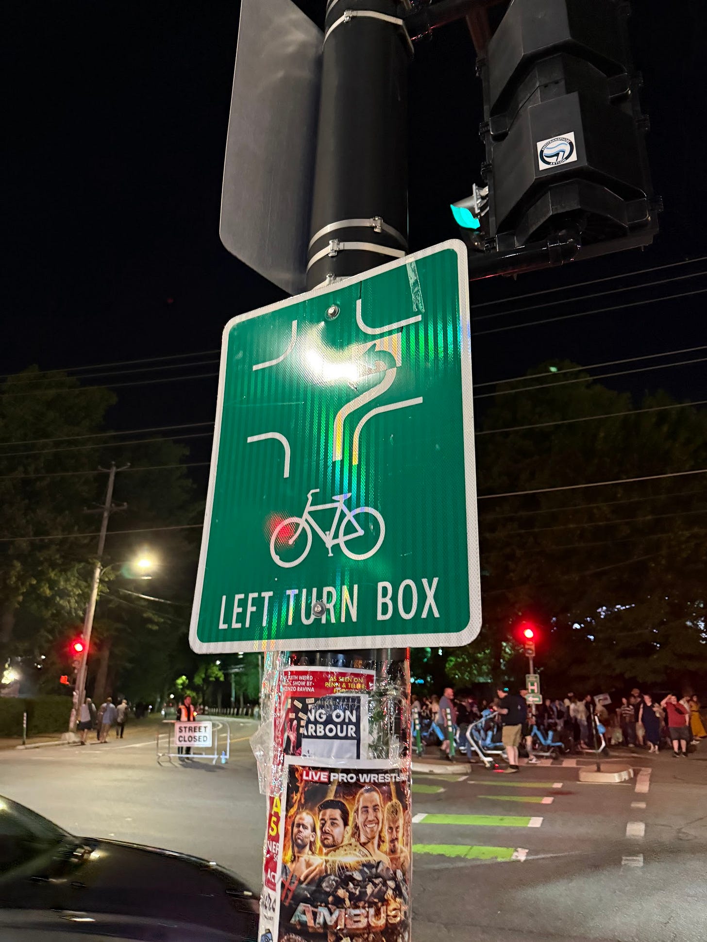 While left turn boxes are used in many cities that I have been to, including right on the University of Pittsburgh’s campus, it is excellent to see instructions on the road to see how to use them.